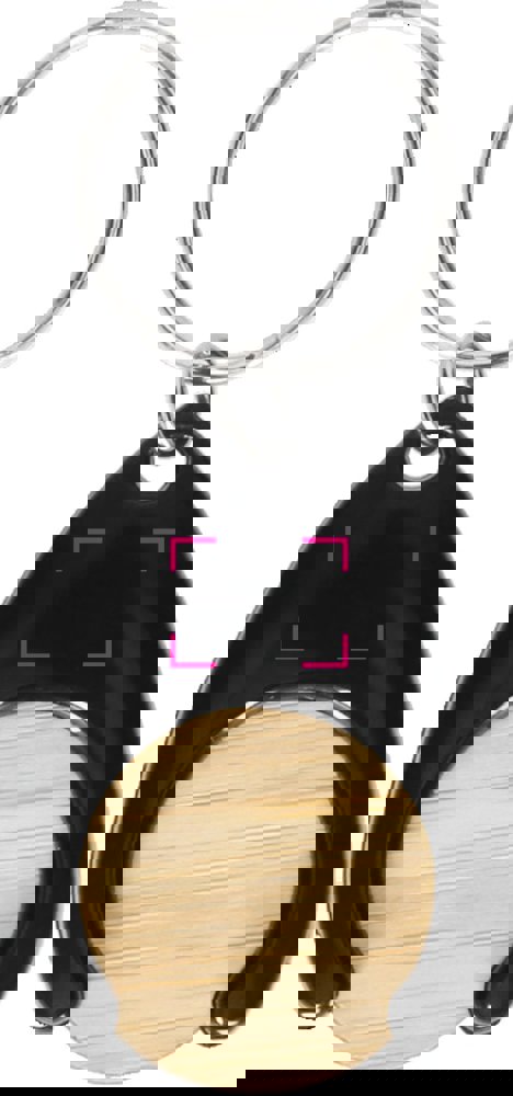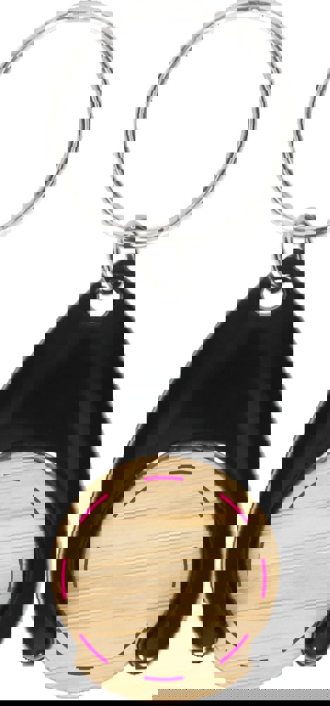 Formschöner Schlüsselanhänger aus Kunststoff mit integriertem Einkaufswagenchip (Ø 24 mm) aus Bambus. Inklusive Schlüsselring.